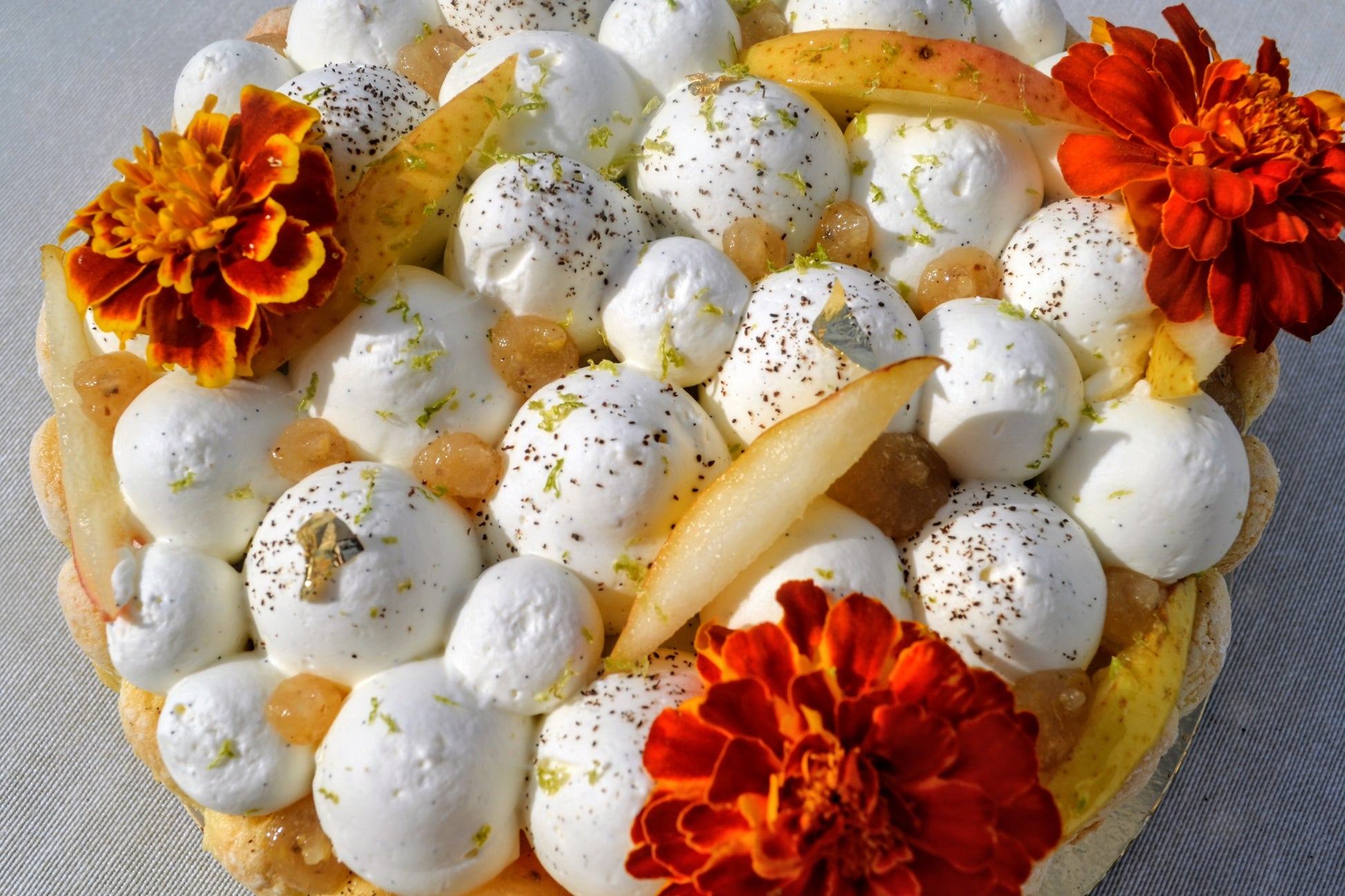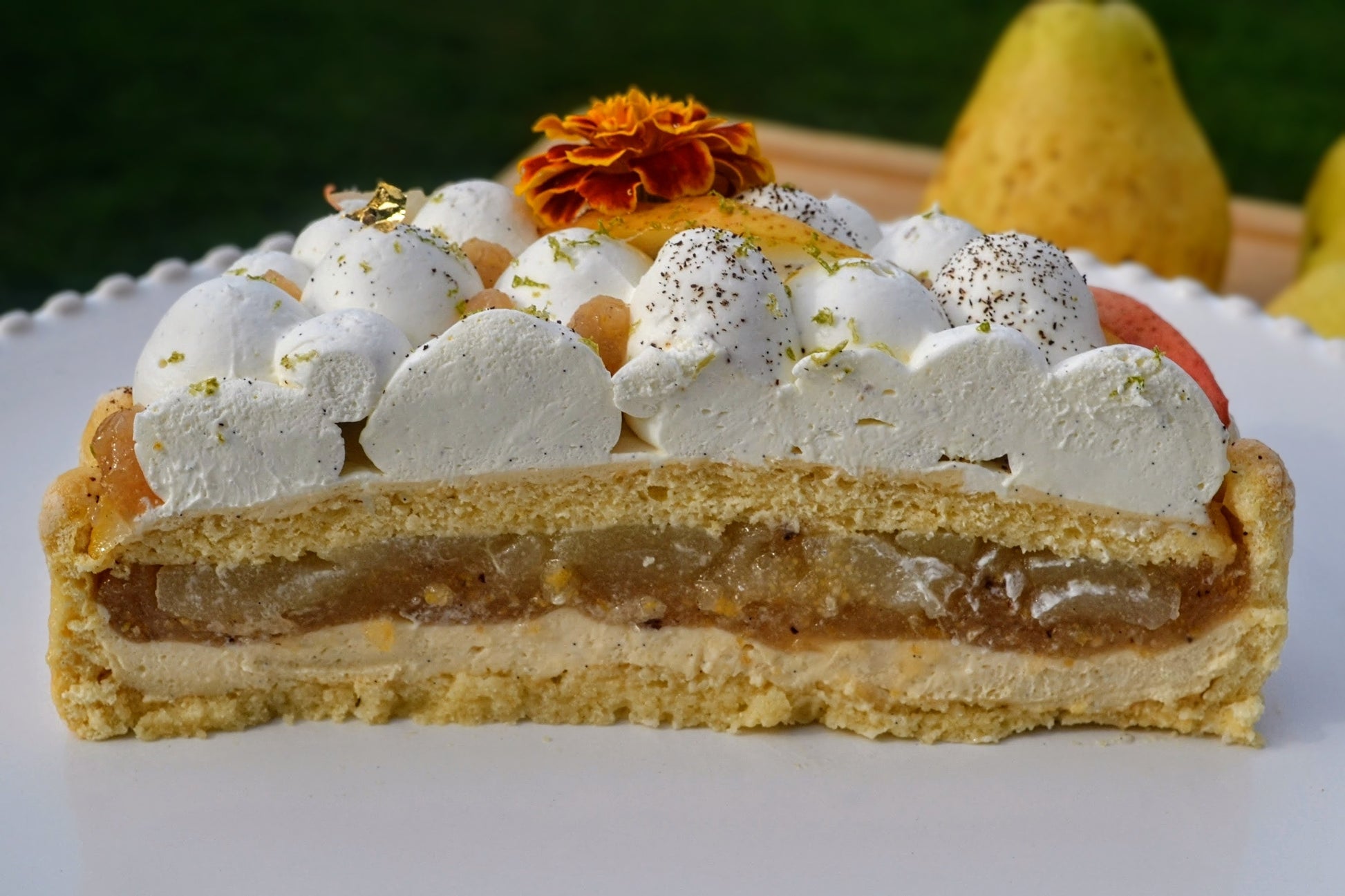Poires locales parfumée à la Vanille, fève Tonka & zestes de citron vert, travaillées sous trois formes: fraîches, en confit, et pochées- biscuit cuillère maison imbibé de sirop maison au citron - crème diplomate et crème chantilly à la Vanille bourbon de Madagascar