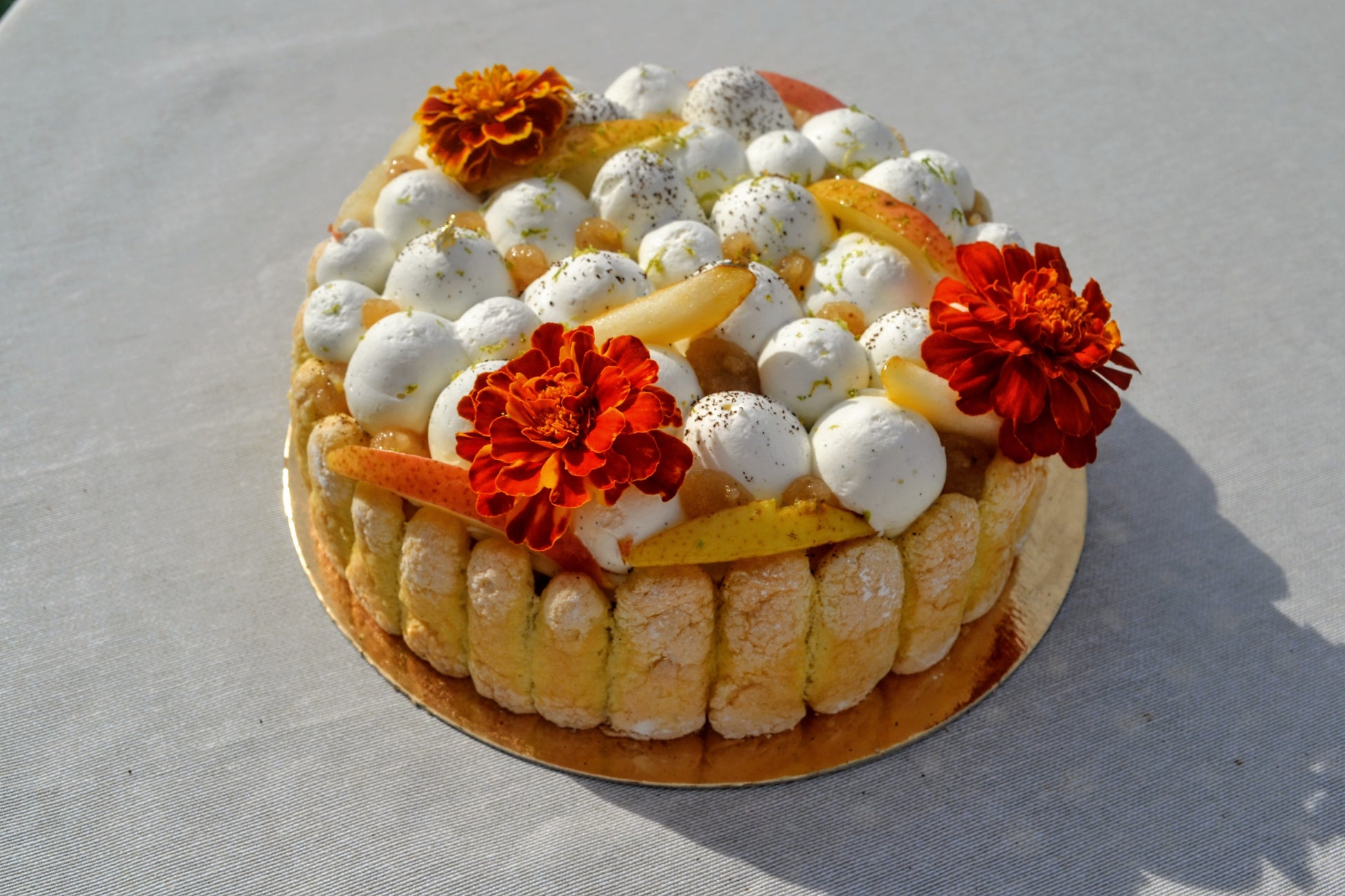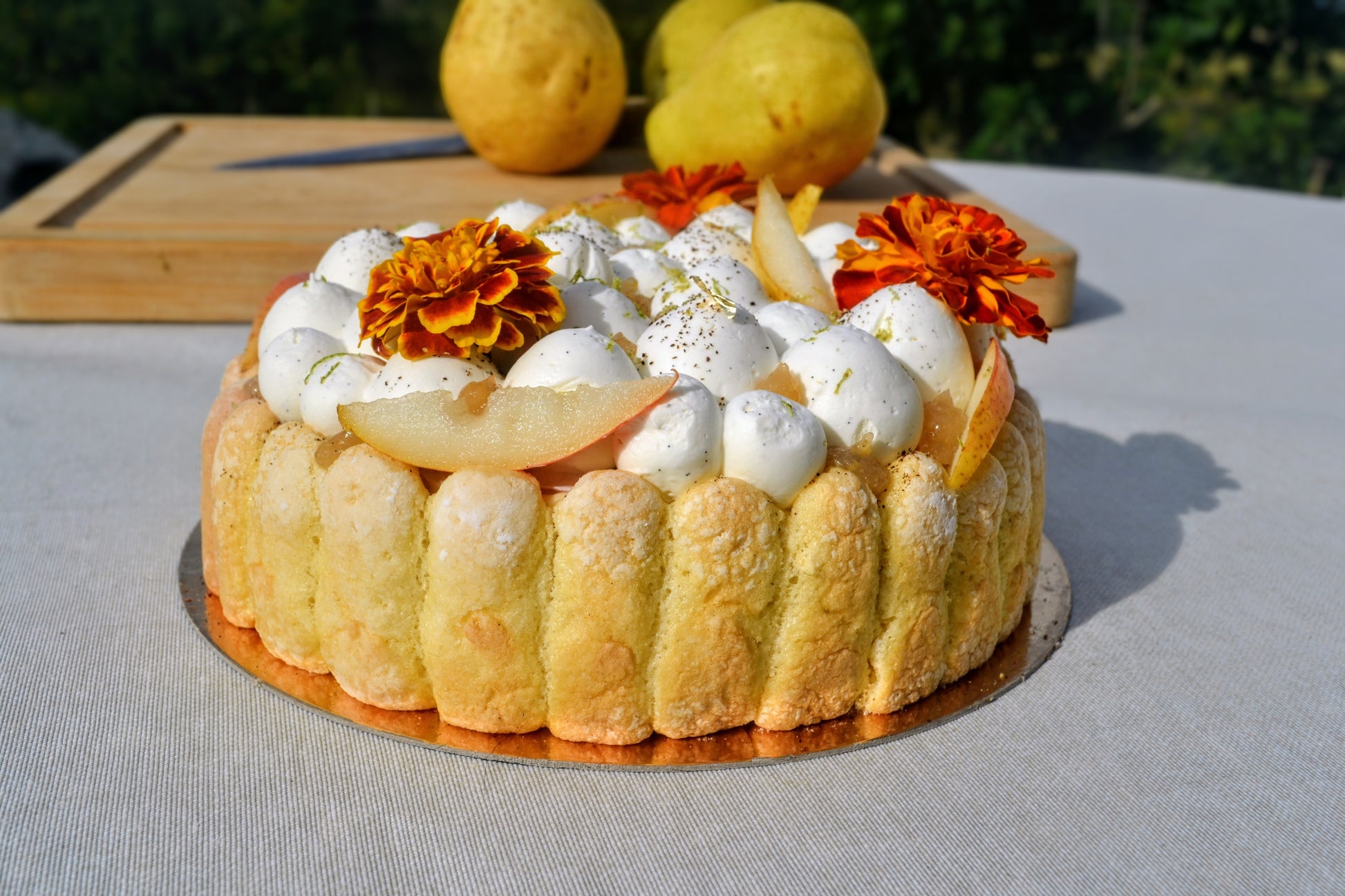 Une charlotte fruitée, légère et parfumée, où la douceur de la poire rencontre les notes gourmandes de la fève Tonka.