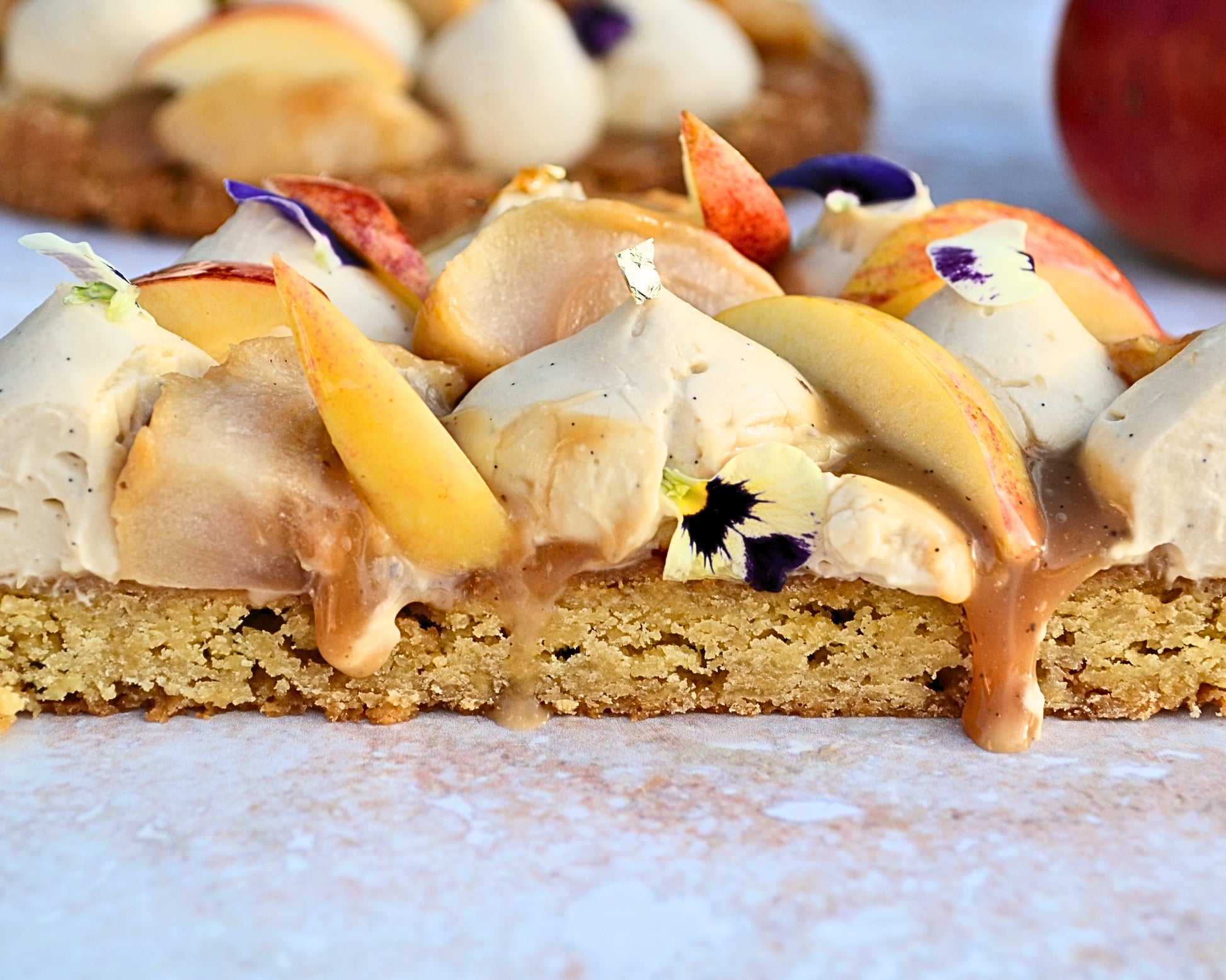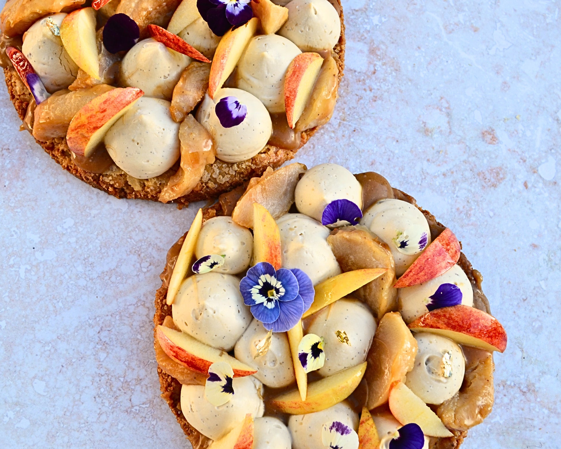 Sablé breton - pommes fondantes rôties au miel - crème légère infusée à la Vanille Bourbon de Madagascar - caramel au beurre salé