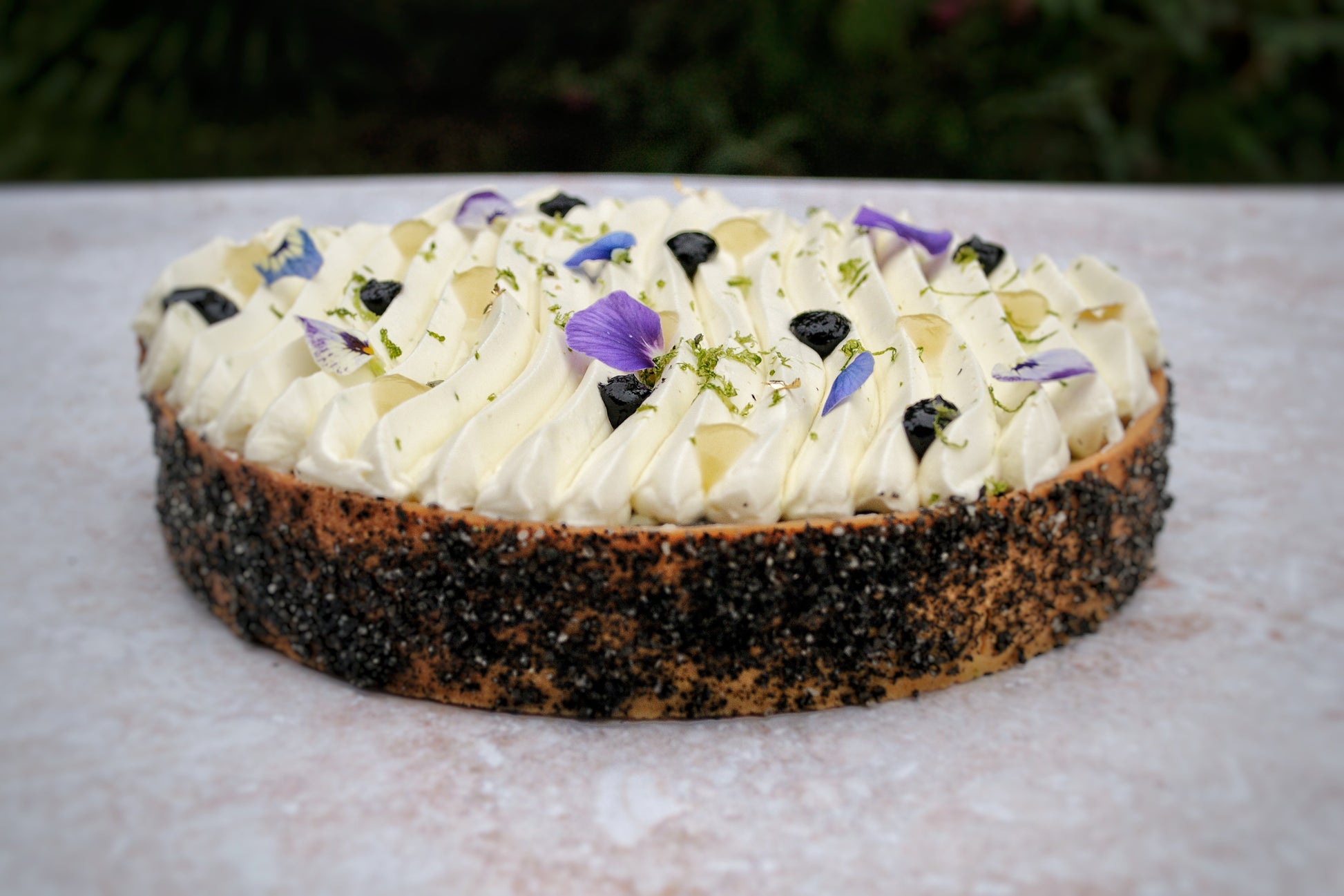 Pâte sucrée dorée au sésame noir - biscuit madeleine citron - crémeux citron jaune- gel citron vert - praliné sésame noir - Chantilly infusée aux écorces de citrons